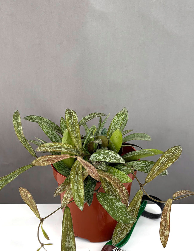 This Hoya is fun to watch trail! The narrow green leaves have splashes throughout and to top it off, the underside of the foliage have a beautiful purple color! A fun plant to sun stress.